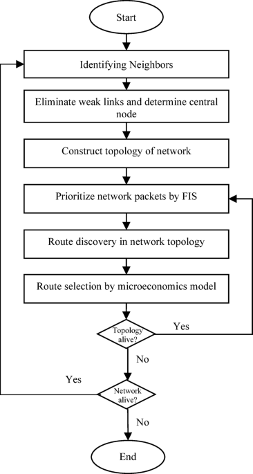 The value of \({P}_{i}\) in Eq. (1) specifies the value of establishing connection with node i, and the microeconomic model in the proposed method uses this criterion as one of the path selection criteria. Each downstream node piggybacks the energy level and the successful routing rate of the related packet on the ACK packets to be received by the upstream nodes. It should be noted that communication overhead is incurred by the control packets that are exchanged in this topology control phase. This overhead is necessary to keep routing information in a dynamic network up-to-date, and it has been included in the overall energy consumption estimates in our simulation results to allow a fair and complete performance assessment. In the second step of FMERA, prioritization of the data packets is performed when the data packet is stored in the buffer memory of the node.