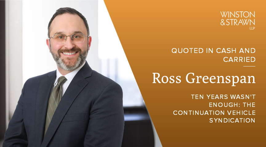 Winston & Strawn’s Ross Greenspan was quoted in a Cash and Carried article examining the rapid growth of continuation vehicles (CVs) and their evolving role in private equity liquidity and GP‑LP alignment. Most CV transactions allow existing LPs to choose from several options, including a full sale for liquidity, a reinvestment into the CV, or a combination of the two through a partial option. A subset of deals extend a “status quo option,” permitting LPs to stay in the existing vehicle or roll into the CV on the same economic terms of the existing vehicle.