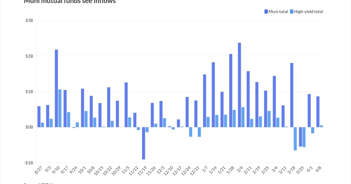 Investors added $866 million to municipal bond mutual funds in the week ended Wednesday, following $931.9 million of inflows the prior week, according to LSEG Lipper data.